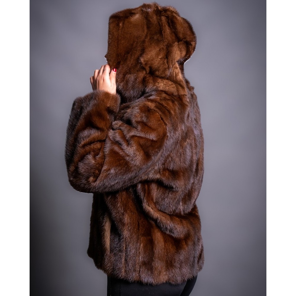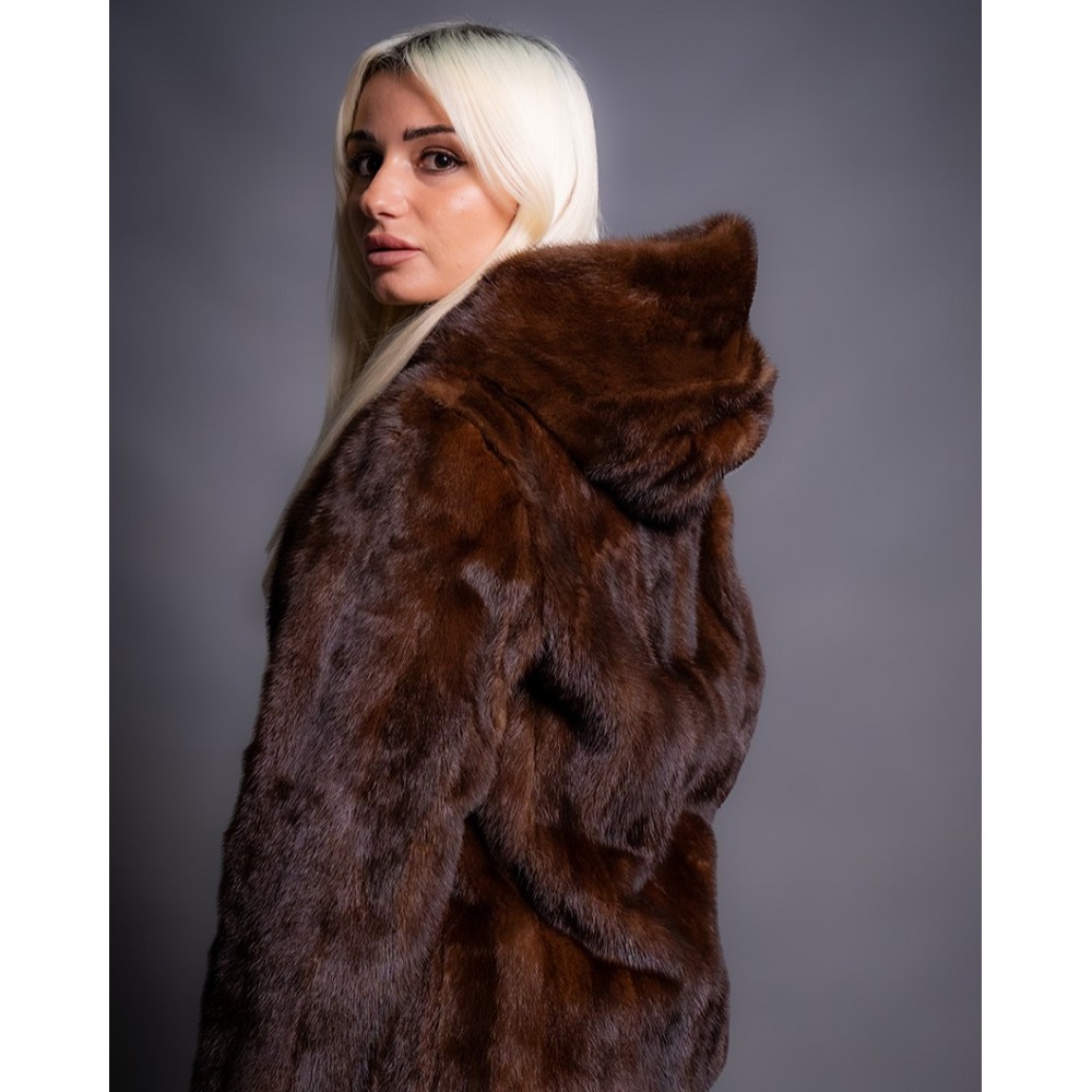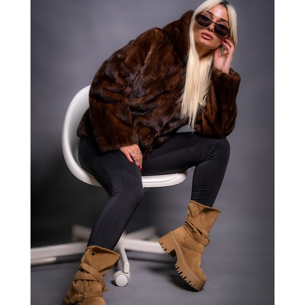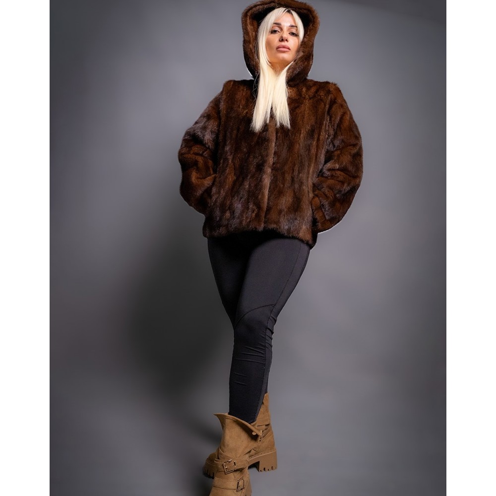 Γυναικεία Γούνα Βιζόν Καφέ με κουκούλα