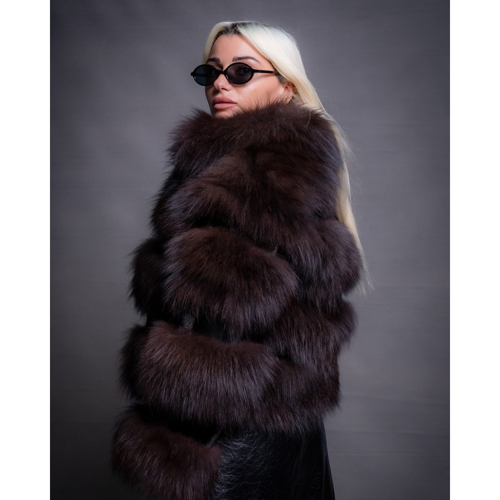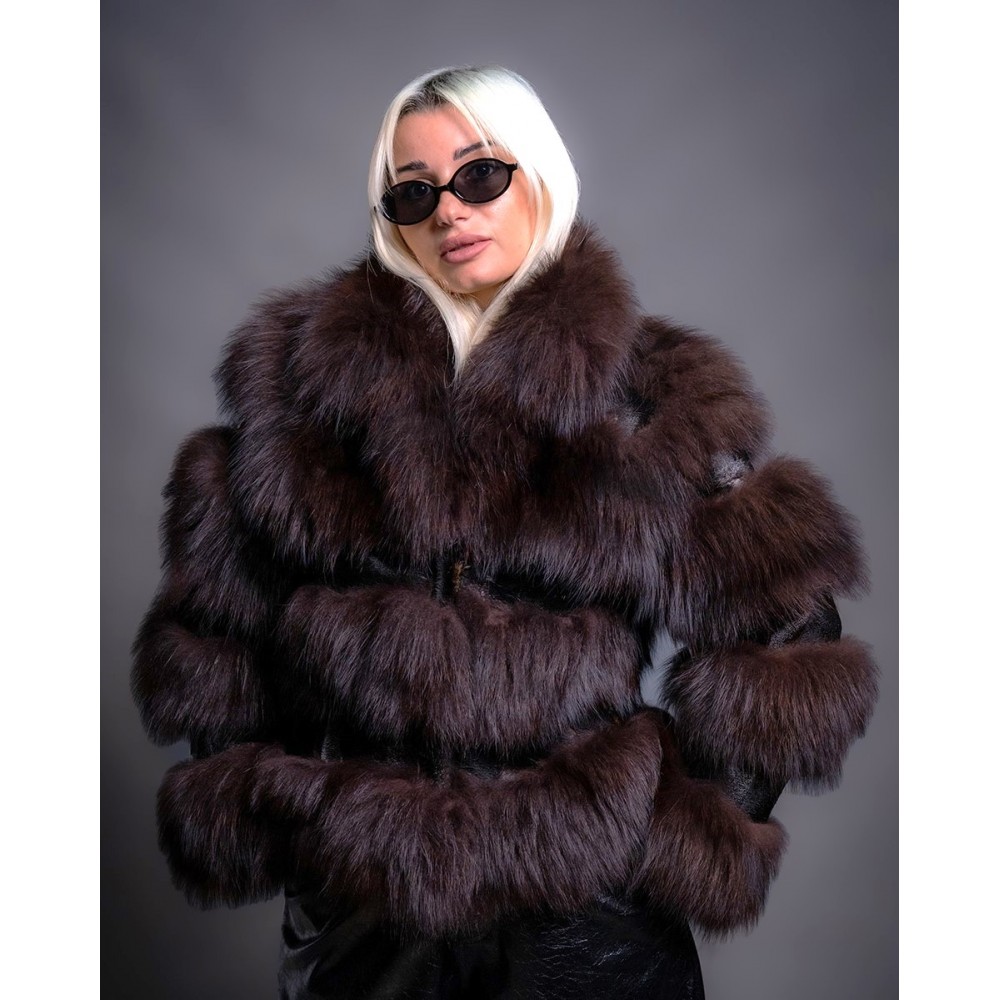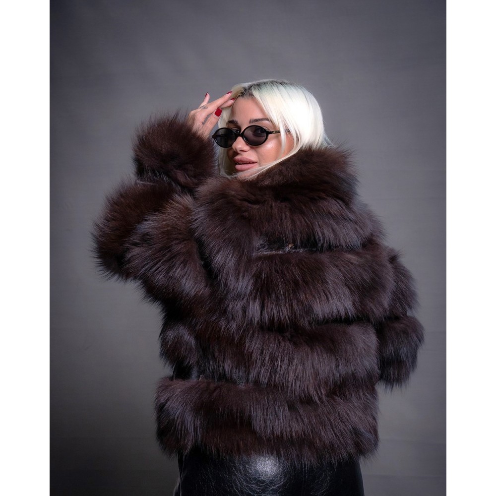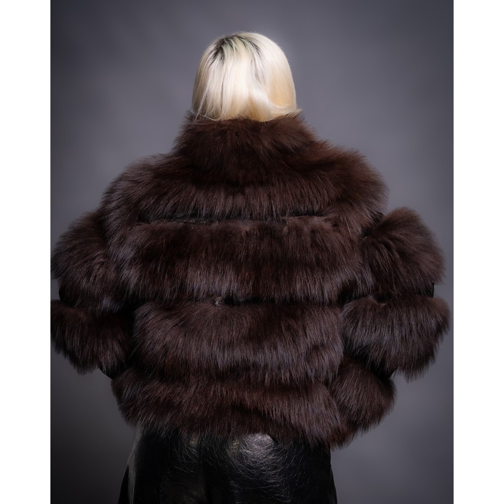 Γούνινη κοντή ζακέτα αλεπού σε σκούρο καφέ
